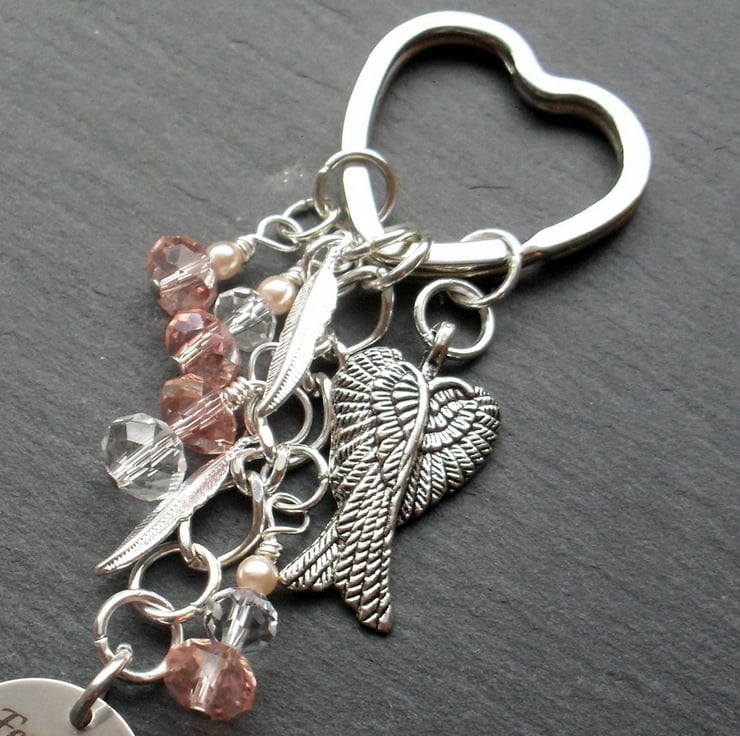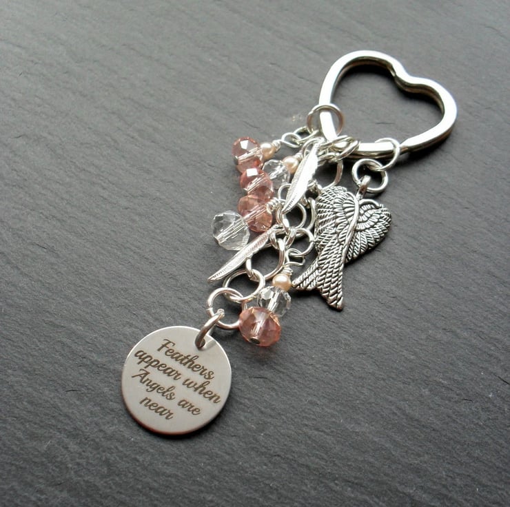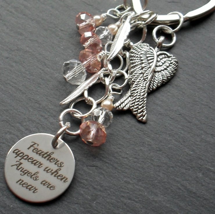Angel keyring with sparkly crystal, and faux pearl beads with feather, angel wing charm and a disc charm with FEATHERS APPEAR WHEN ANGEL ARE NEAR written on.
