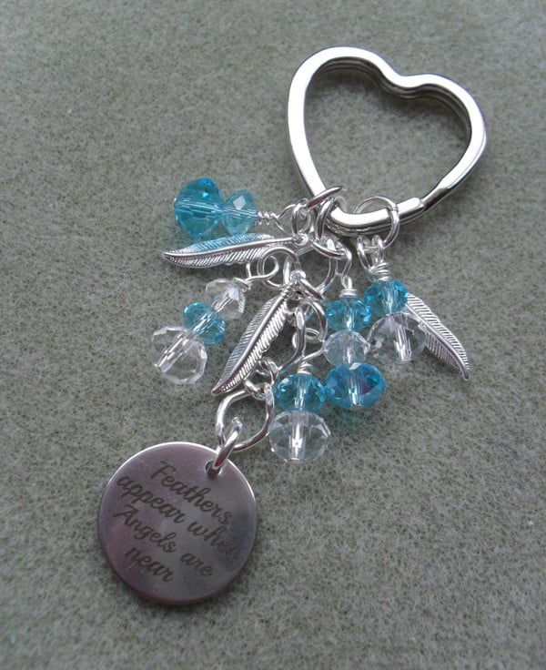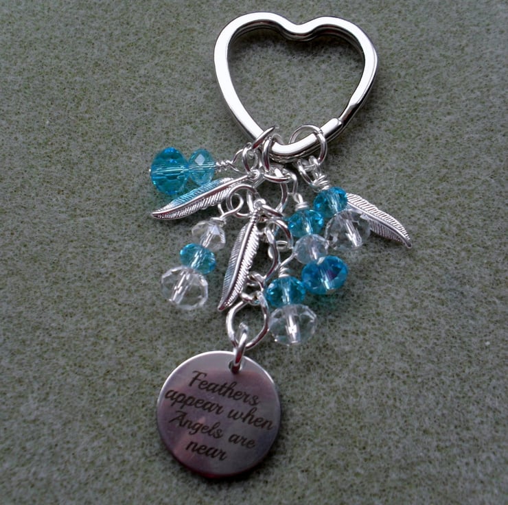 SALE NOW £3 WAS £5.50 Angel keyring with sparkly crystals, feather charms and a disc charm with FEATHERS APPEAR WHEN ANGEL ARE NEAR written on.