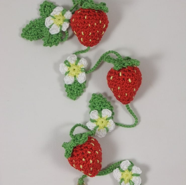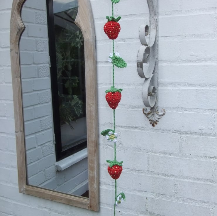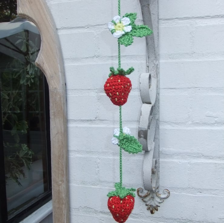 This strawberry hanger would add summer cheer to any room! It is crocheted in 100% cotton and the strawberries are filled with polyester stuffing. There is a small Indian brass bell tied to the bottom for a little added weight to help it hang straight . This decoration measures approximately 77 cm long from the top of the hanging loop to the bottom of the ‘string.’