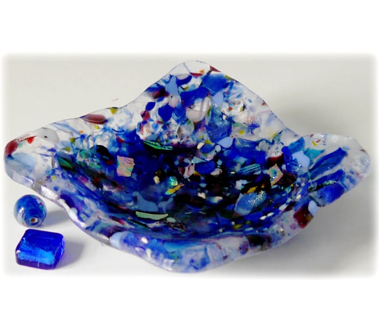I fused it to 1500 degrees to melt it all together and then slumped it onto a little dish shape with the corners draped over to give the rustic shape