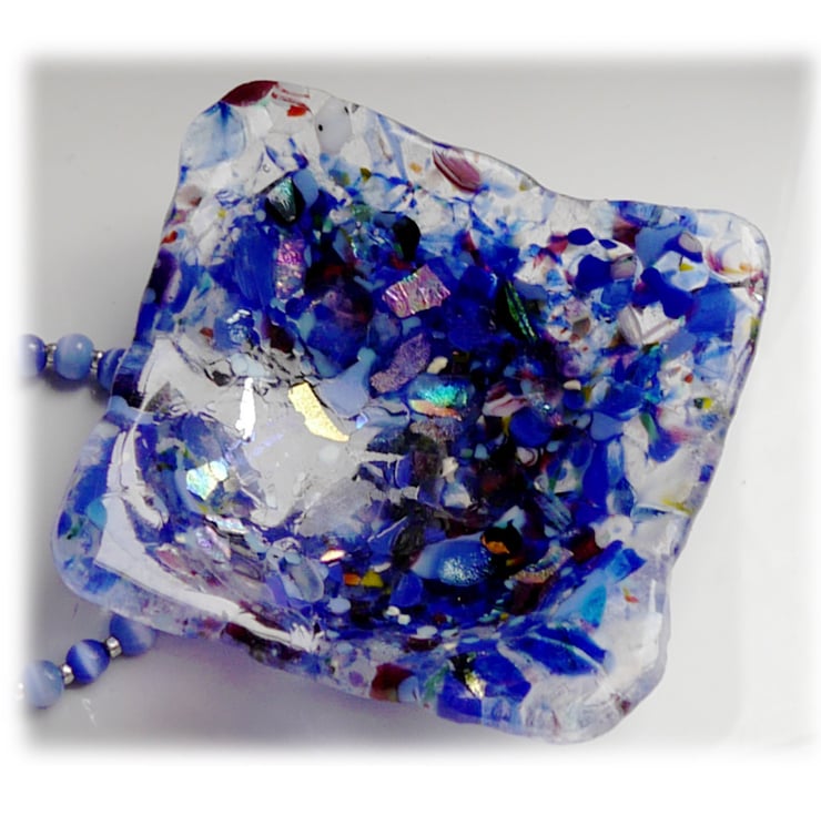 I've made it entirely from frit / small glass pieces. All piled together to form a square then scatted with lots of my precious dichroic glass to give lovely sparkles here and there. I've used a base of blue and clear then added some lovely plum and bright dichroic which together give a lovely sparkly, colourful effect.