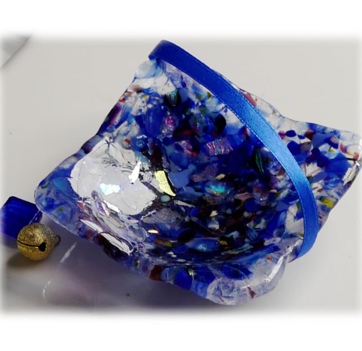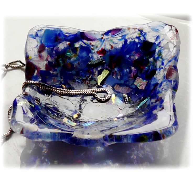 A little, 8.5 cm square dish, twice fired in my kiln, first to full fuse all the glass together, 2nd to slump it over a little round mould into a pretty dish shape.
