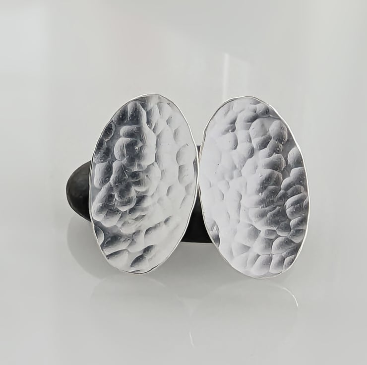 Handmade, cutting the oval out of 1 mm thick sheet sterling silver, hammering into the metal with a small ball pen hammer creating a dimple texture and finishing off, tumbled with a satin finish.
