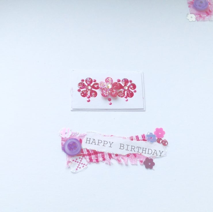 The greeting is a printed on a torn piece of card, keeping to the theme of collage work. I have then placed this on frayed pieces of ribbon and fabric.