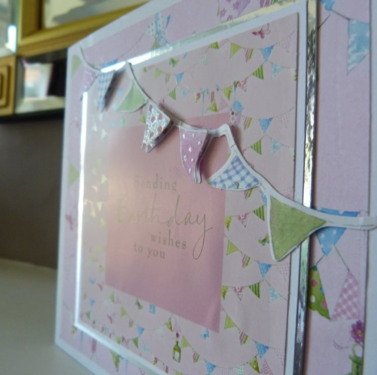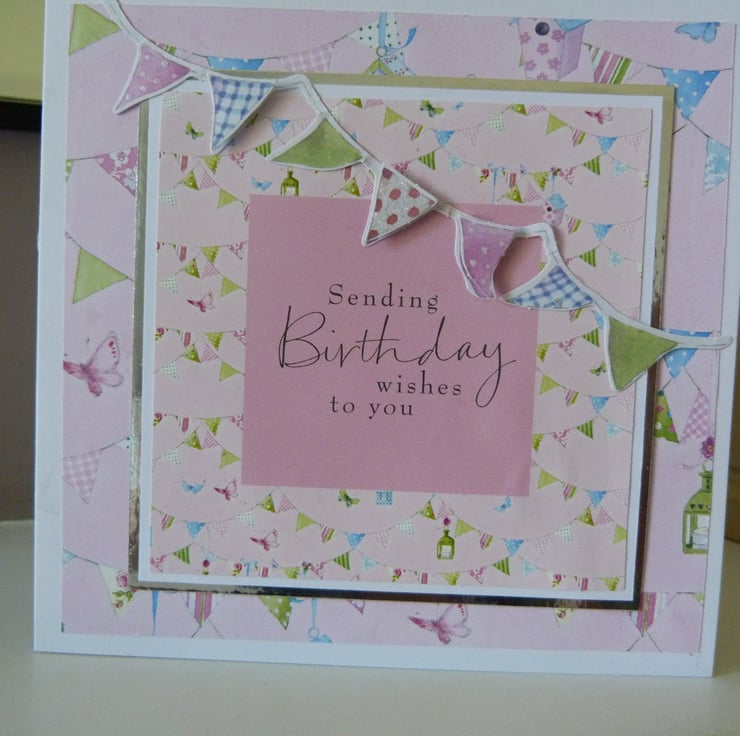 A completely handmade card. Bunting pink patterned paper with sending birthday wishes to you mounted onto white card, then silver mirri card then more bunting paper then quality pristine white card. Finished off with a row of co-ordinated decoupage bunting.