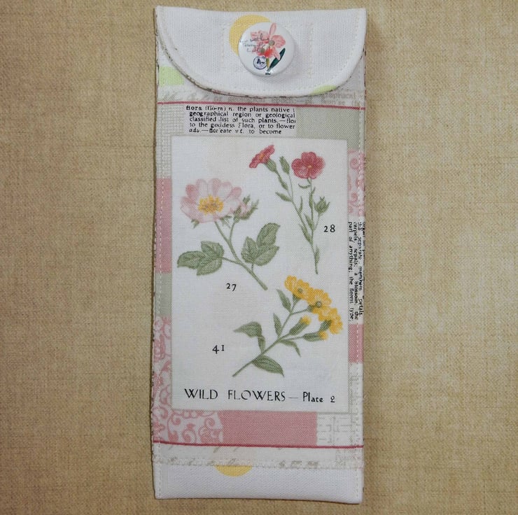 This is a handy case for your glasses or sunglasses, which features an appliqued panel of Wild Flowers which has been added to a pale spot fabric. It has a toning floral lining. It also has a layer of wadding for protection. The case fastens with Velcro, and has a decorative button. This would make a lovely present.