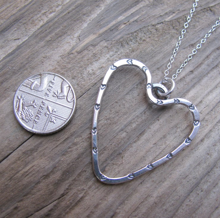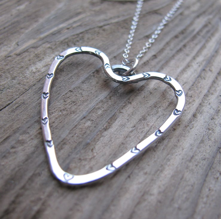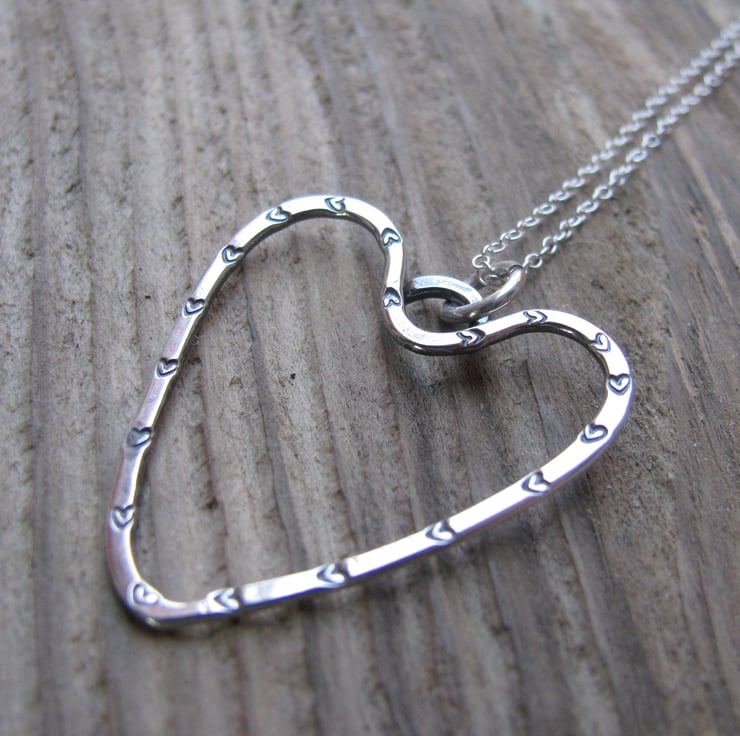 Made from thick sterling silver wire, annealed, bent into a heart shape, soldered, hammered and stamped with tiny hearts. Finally tumbled for a nice polish. Suspended from a sterling silver ( hallmarked ) delicate 18" trace chain.