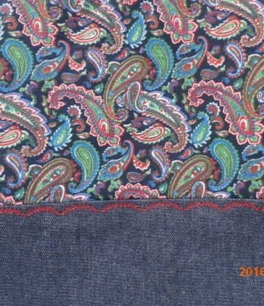 Decorattive stitched pattern in red along seam joining denim to paisley print to add detail .