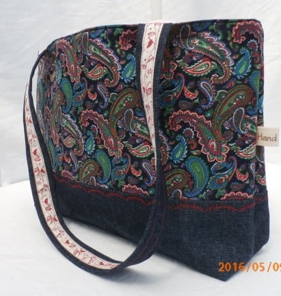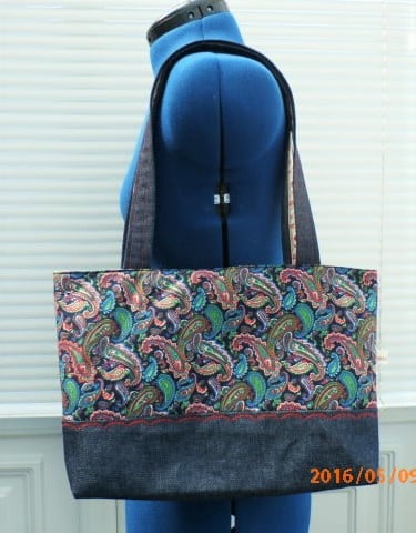 Tote bag in paisley print poplin cotton with denim handles and box base .