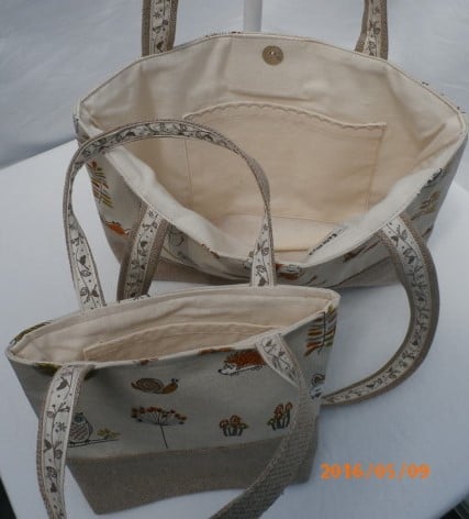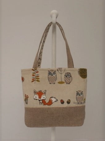 Both bags are made in Woodland friends cotton fabric with Mr Fox and his friends owl, snail, hedgehog , butterfly and flowers.