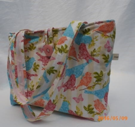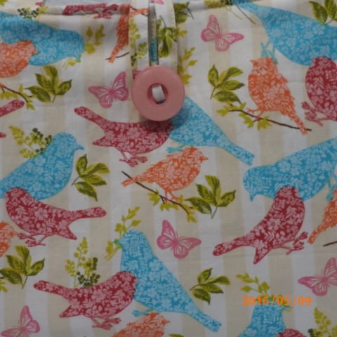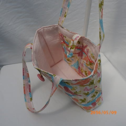 This bag is made in a 100% coton fabric with birds , flowers and butterflies print , in blue, pink and orange. on a cream and white stripe back ground .