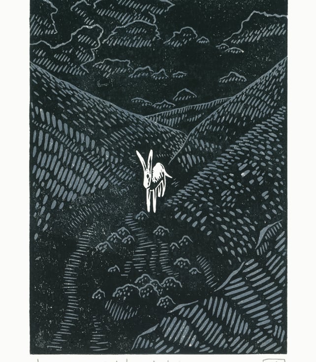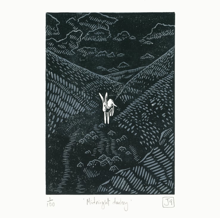 A 2-colour linocut print entitled 'Midnight Donkey'.