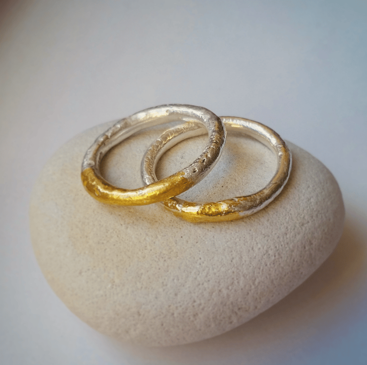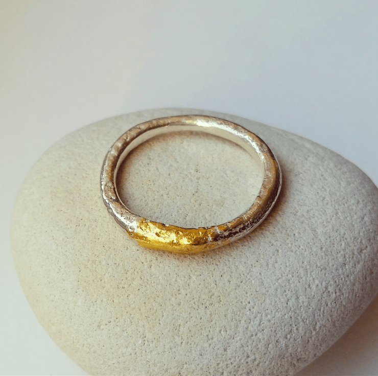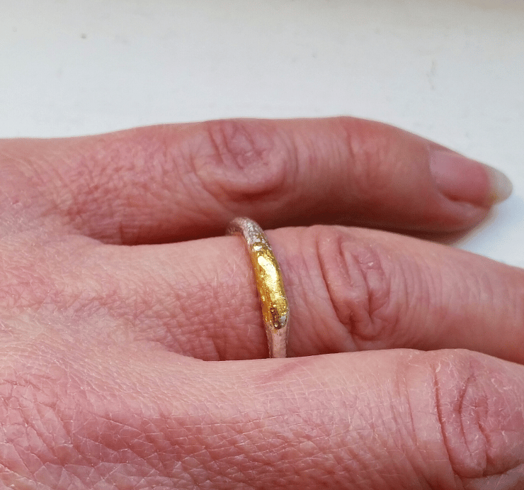 This is for one organic feeling handmade fused sterling silver ring with a lovely natural texture and ancient look (3 pictured above). This simple ring has an irregular distressed texture and has been subtly accented with 24 carat gold to make a warm contrast.