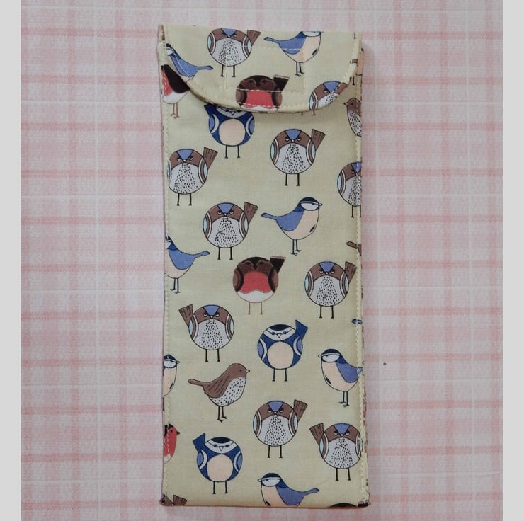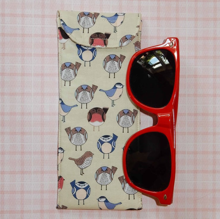 This is a handy case for your glasses or sunglasses, which is made from a beautiful fabric featuring birds, such as robins and blue tits. It has a toning print lining. It also has a layer of wadding for protection. The case fastens with Velcro. Perfect for glasses or sunglasses.