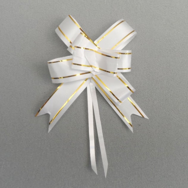 The white and gold ribbon is approximately 16mm wide and the final bow measures approximately 50mm in diameter.