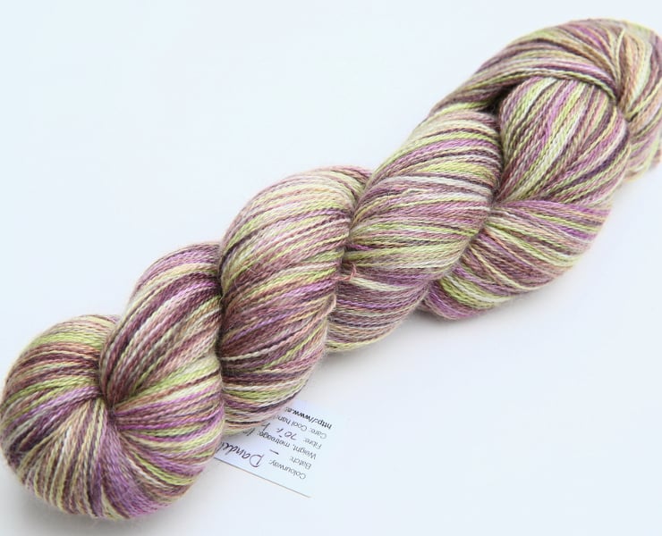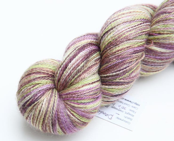Soft shades of yellow-green, mauve, lilac, aubergine, cream (undyed) and hints of tan. This gorgeous and luxurious yarn has the softness and warmth of alpaca with the smooth sheen and cool feel of silk. It should make beautiful lace projects. Photographs have been taken and edited in bright natural light.