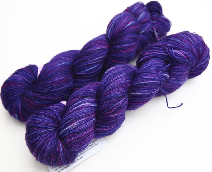 Shades of violet, purple and pink. This Bluefaced Leicester superwash yarn is soft with a very slight lustre. There is one skein left. Photos taken and edited in bright natural light.