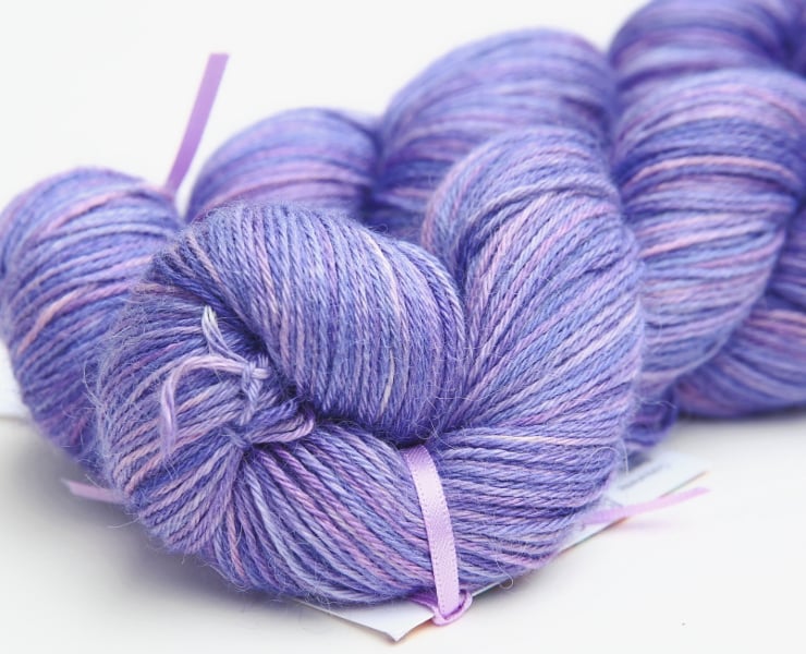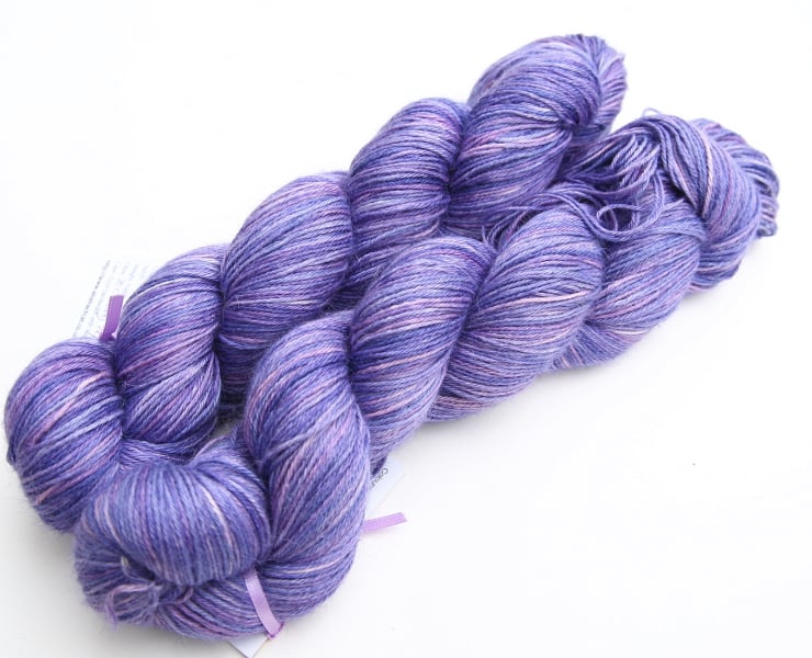 Shades of lavender and lilacs. This gorgeous and luxurious yarn has the softness and warmth of alpaca with the smooth sheen and cool feel of silk. This is the 4-ply/sock weight equivalent of the my bestselling silky baby alpaca laceweight, and combines the softness and luxury of the baby alpaca/silk blend with the versatility of 'sock' yarn. There are two skeins available, price shown is for one. Photographs have been taken and edited in bright natural light.