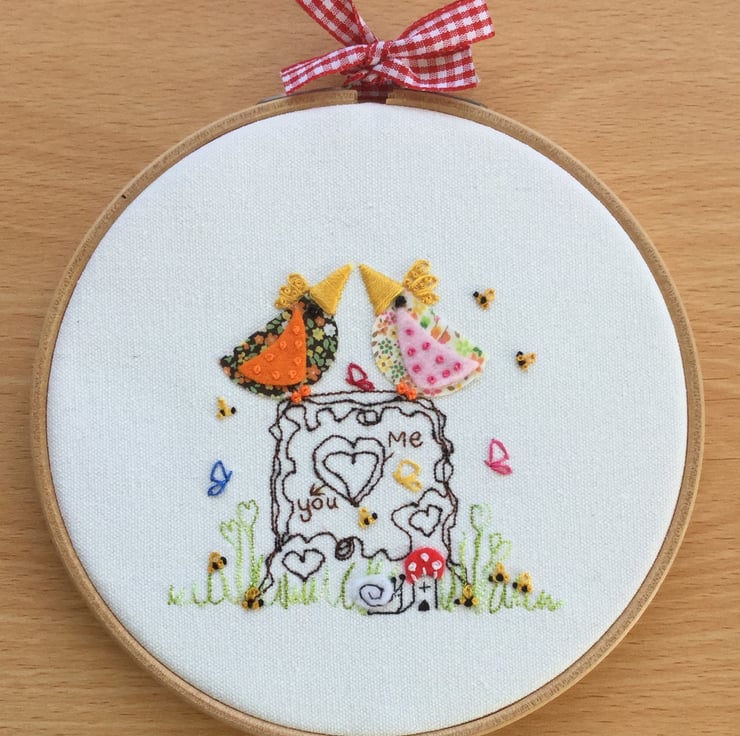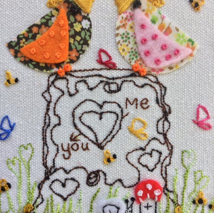 This design could be personalised to incorporate initials and dates of your choice. Made using a mixture of freemachine and hand embroidery. I have appliqued two tiny Liberty print chickens on top of a quirky tree stump to give this design a whimsical feel.