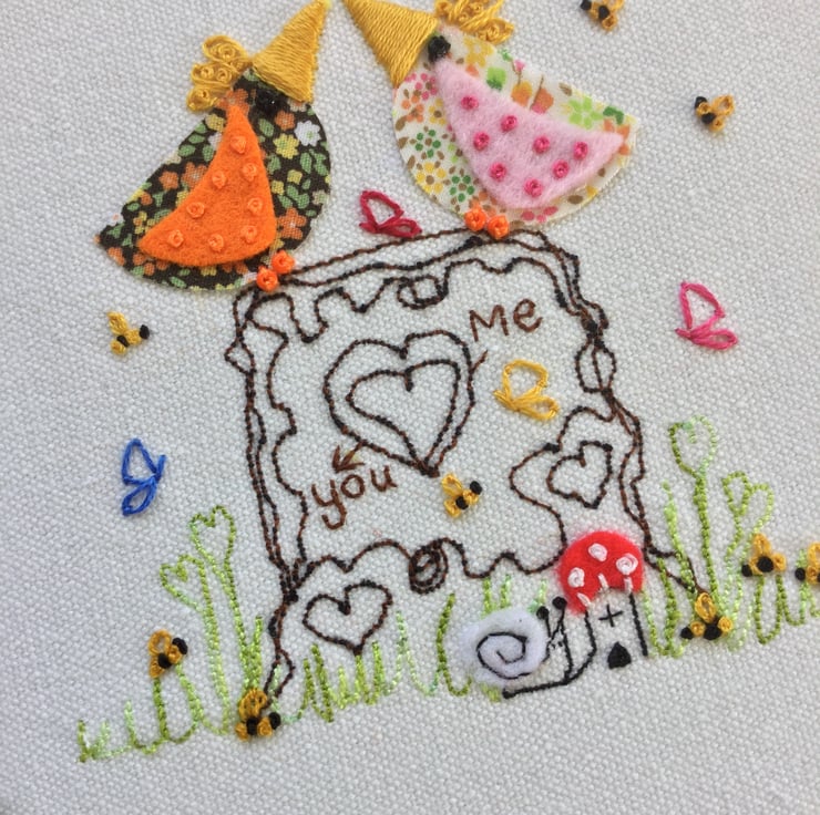Please contact me through Folksy to pass on your information and any other details that you may like incorporating into the design. Where possible I can embroider extra bees, hearts, butterflies and music notes!