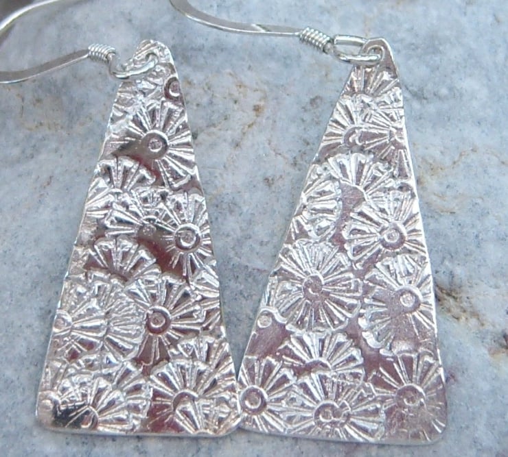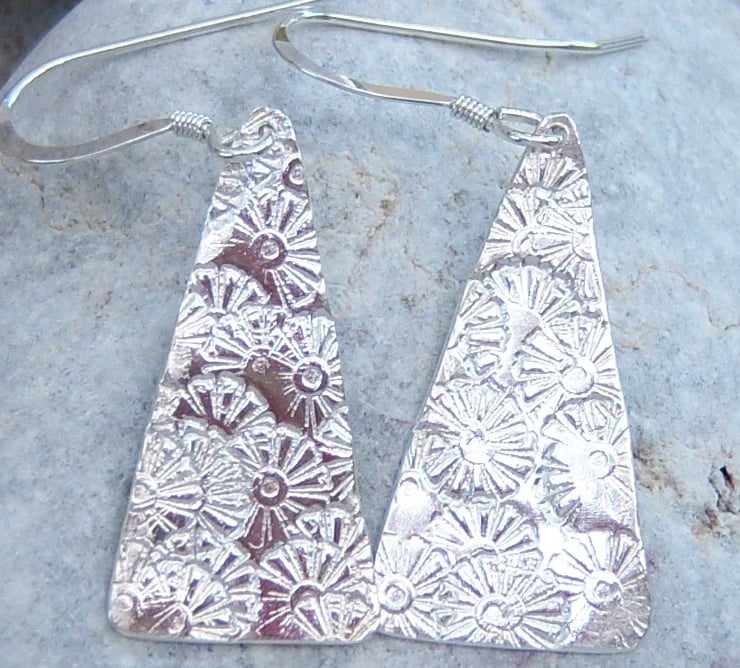 Sterling silver triangular shaped earrings. A random daisy flower pattern forms the texture.