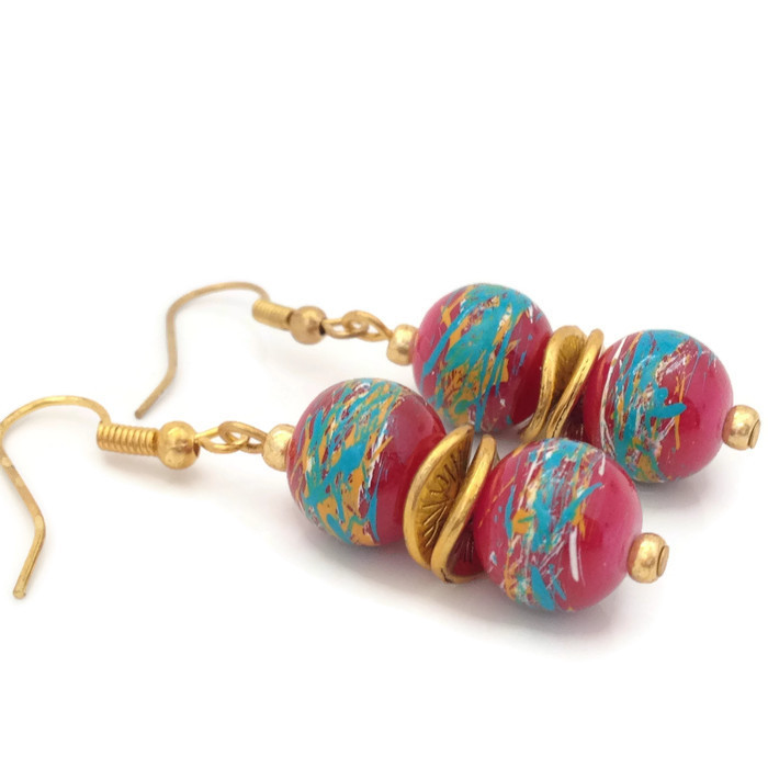 I have used two of the beads in each of the earrings with the gold plated wavy spacer beads in the middle. Each earring has been attached to s gold plated ear wire and has a drop of approximately 3cm (1 3/16") from the bottom of the ear wire.