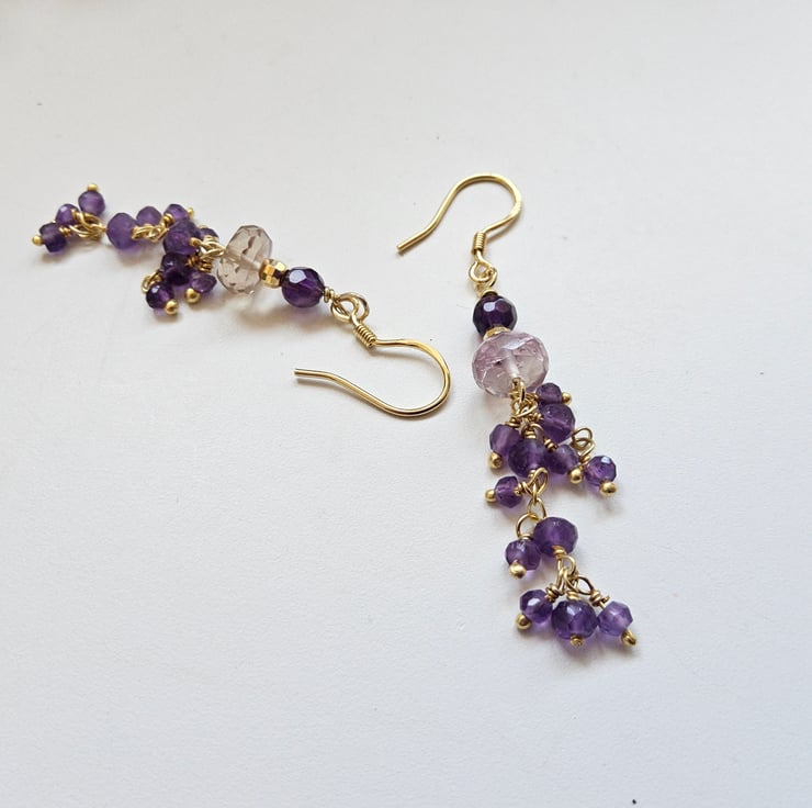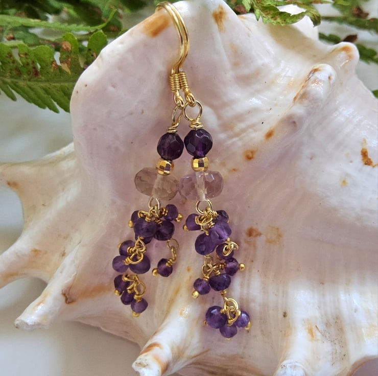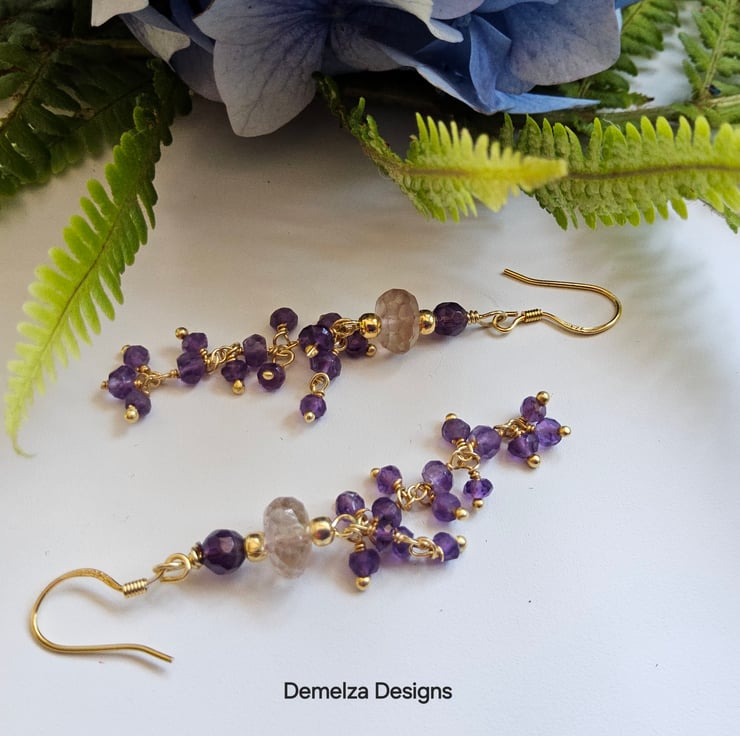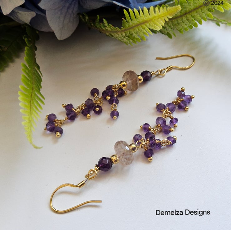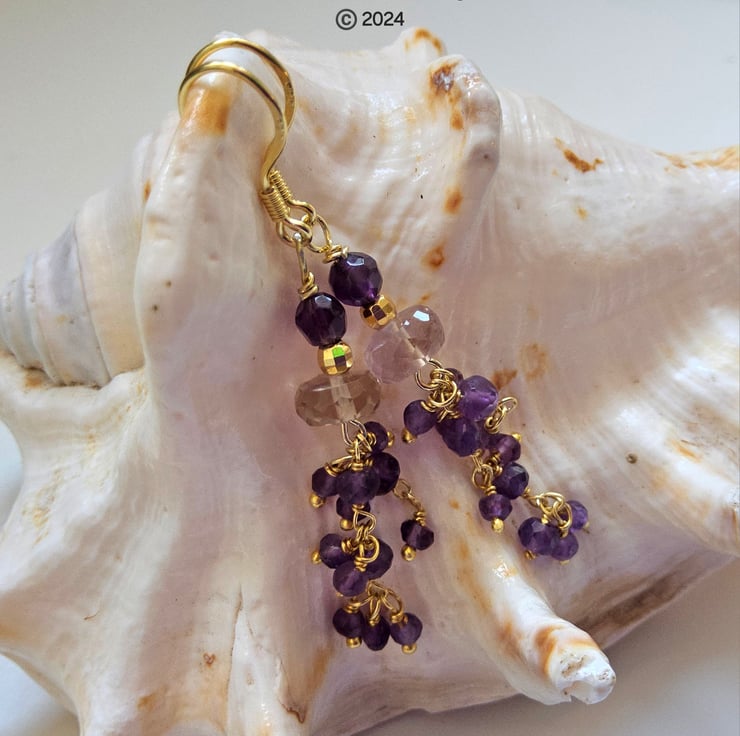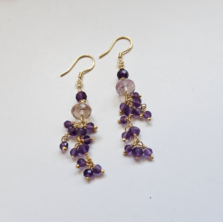 A lovely opulent pair of dangle design genuine amethyst and rare amatrine gemstone earings created using yellow gold vermeil components. Vermeil is a layer of gold electroplated over sterling silver only. Each tiny amethyst has been hand wrapped using quality fine vermeil jewellers wire. These earings have not been mass produced and they took a lot of time and skill to create for the special person who will be receiving them.