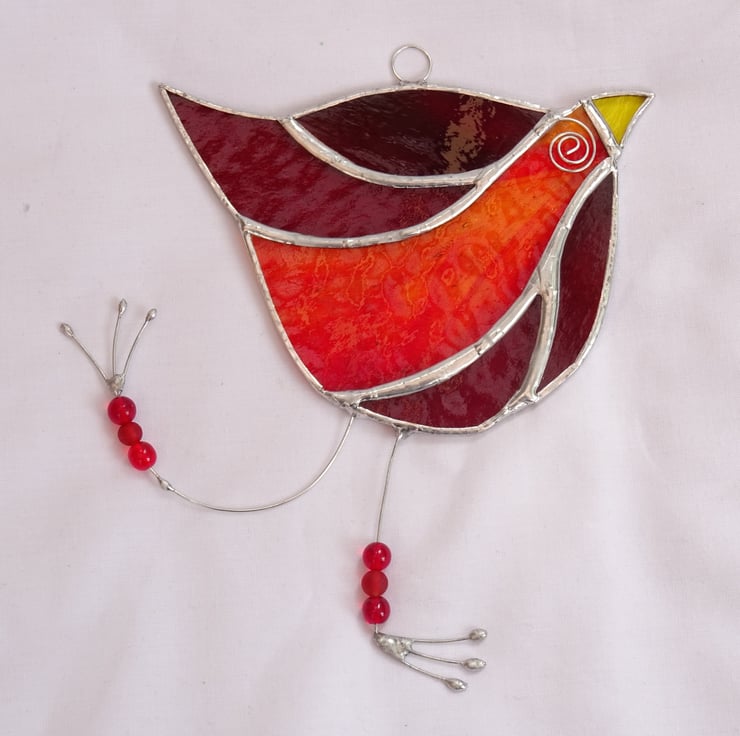 This has been made from different types of red stained glass which vary from streaky red bullseye which looks orange to deep red corella. Each piece of glass has been copper foiled and soldered together with a generous bead on the joints for add strength. Legs and feet have been made from tinned wire and glass bead threaded on.