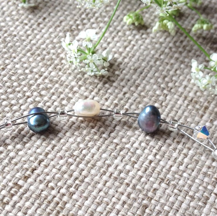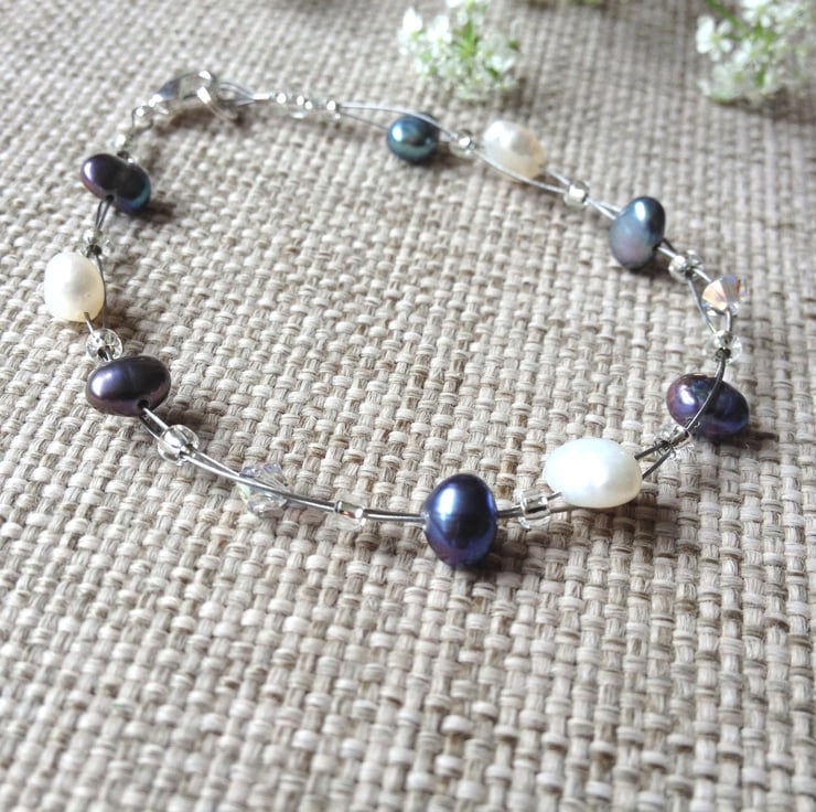 A lovely delicate bracelet made with cream and peacock-coloured freshwater pearls and sparkly Swarovski crystals. The pearls and crystals are woven between two strands of beading wire to create a dainty 'floating' effect. The bracelet is approximately 19cm long with a silver-plated lobster clasp. A beautiful bracelet suitable for any occasion, day or evening.