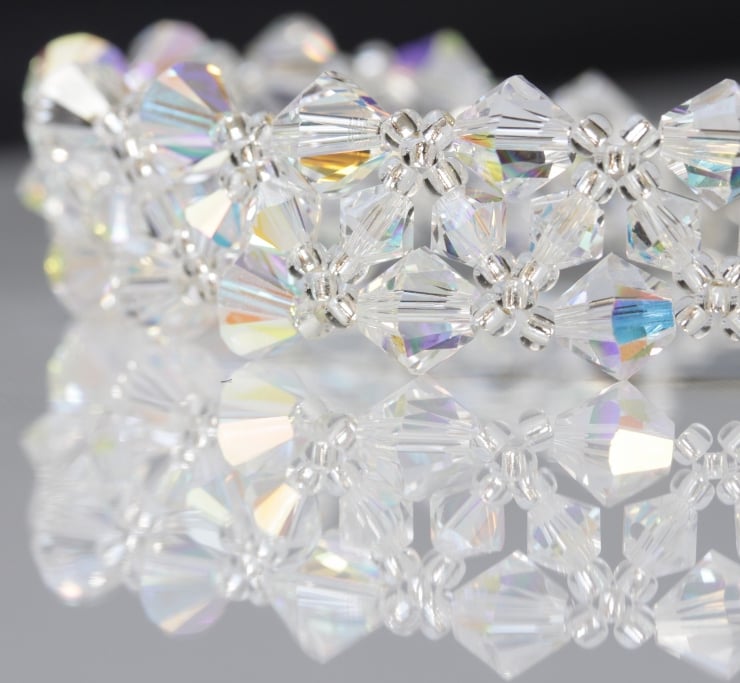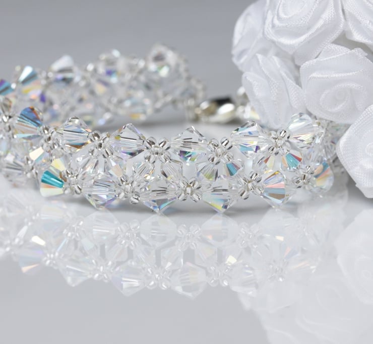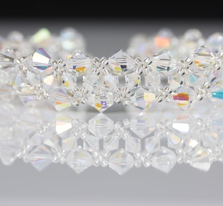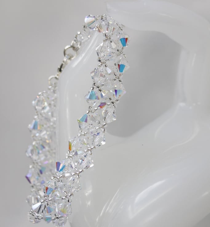 It incorporates 6mm and 4mm Swarovski crystal bicones (xilions) with tiny silver lined glass seed beads in a chevron weave. The crystals have an AB (aurora borealis) coating to give them extra sparkle; this is a thin, transparent metallic covering to part of the crystal to give a lovely iridescent sparkle. It is finished with a silver plated clasp.