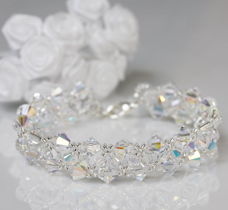 It incorporates 6mm and 4mm Swarovski crystal bicones (xilions) with tiny silver lined glass seed beads in a chevron weave. The crystals have an AB (aurora borealis) coating to give them extra sparkle; this is a thin, transparent metallic covering to part of the crystal to give a lovely iridescent sparkle. It is finished with a silver plated clasp.