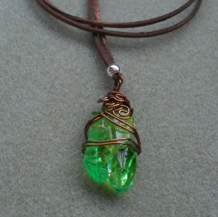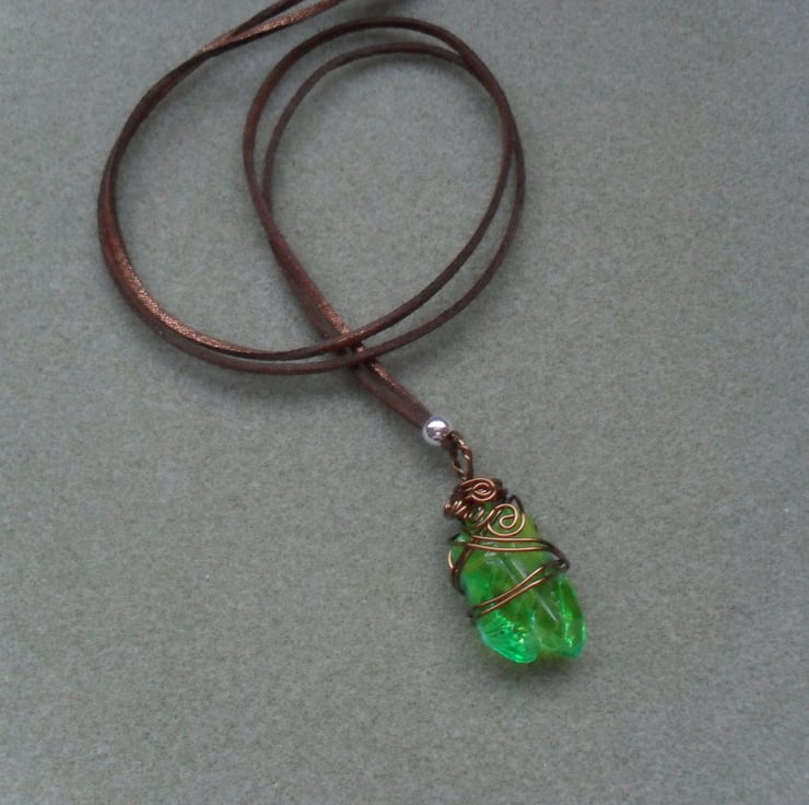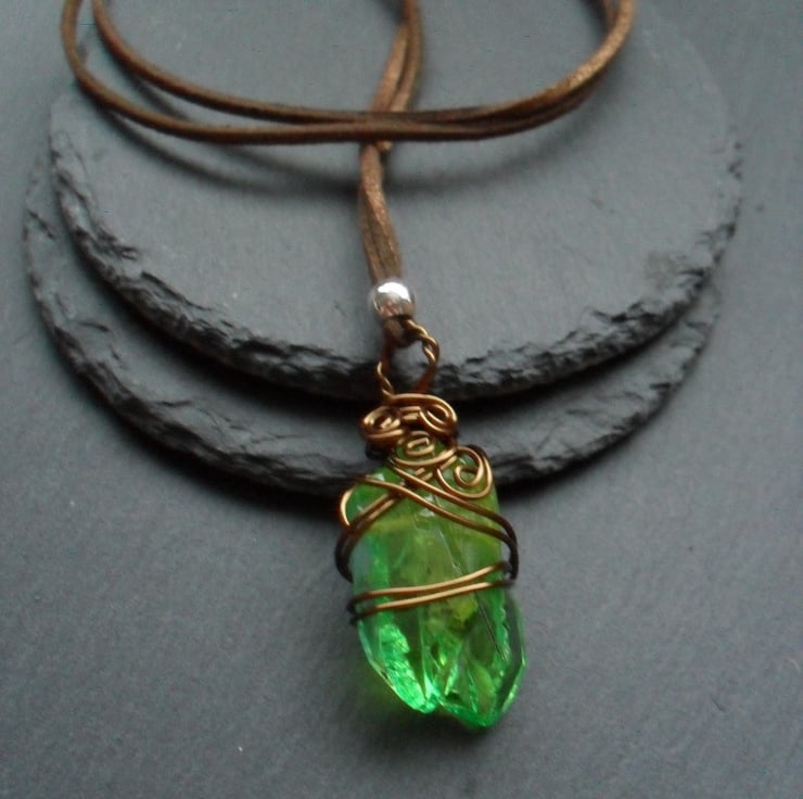 Green dyed quartz with tones of blue which can be seen as the stone moves, drop semi precious gemstone, which has then been wire wrapped with bronze plated copper wire which has been coated to resist corrosion
