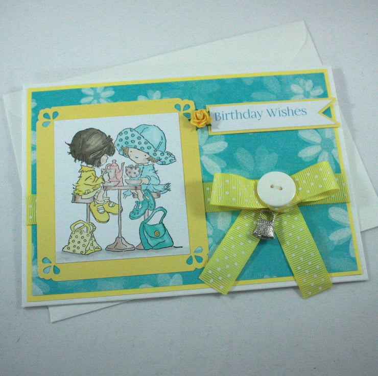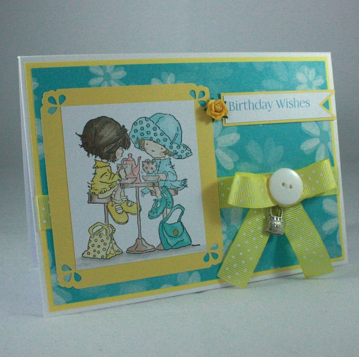 Bright coloured birthday card featuring a hand stamped and coloured image of two ladies meeting for a cuppa. The image has been framed in bright yellow card and overlaid onto a pretty floral turquoise background. The message 'Birthday Wishes' has been printed onto a small banner. Tthe card is finished with a yellow polka dot ribbon bow and white button, a metal handbag charm and small yellow paper rose.