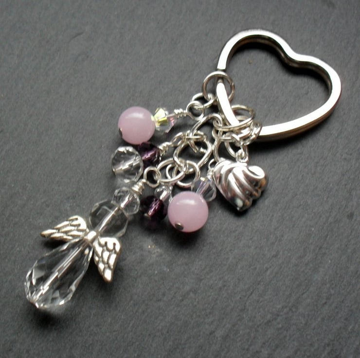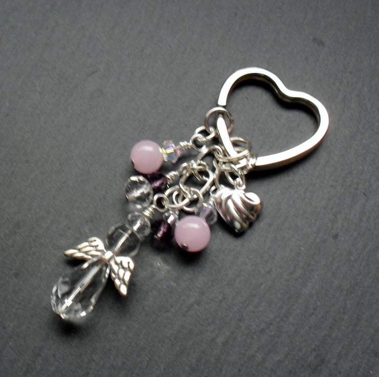 Angel keyring with crystals and quartzite semi precious gemstones are attached to a strong heart shaped split ring.