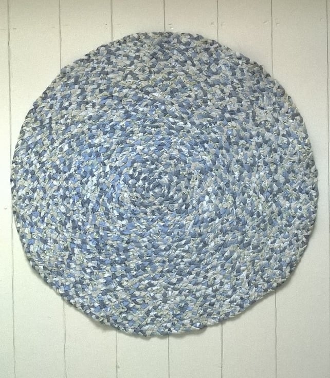 A hand braided round rug, using cotton fabrics in fresh vibrant seaside colours.