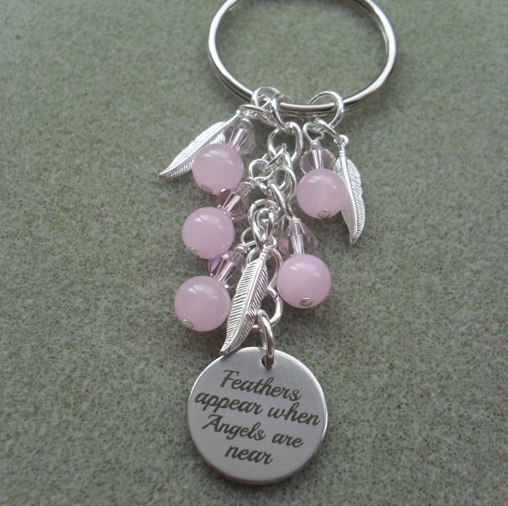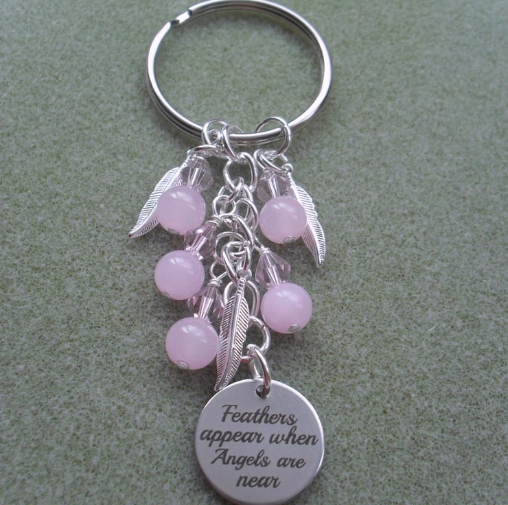 Angel keyring with pink sparkly crystals, and pink quartzite semi precious gemstones with silver plated feather charms and a stainless steel disc charm with FEATHERS APPEAR WHEN ANGEL ARE NEAR written on.