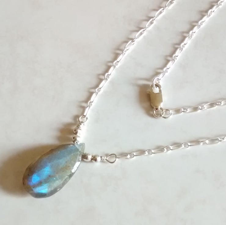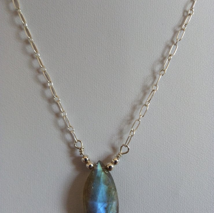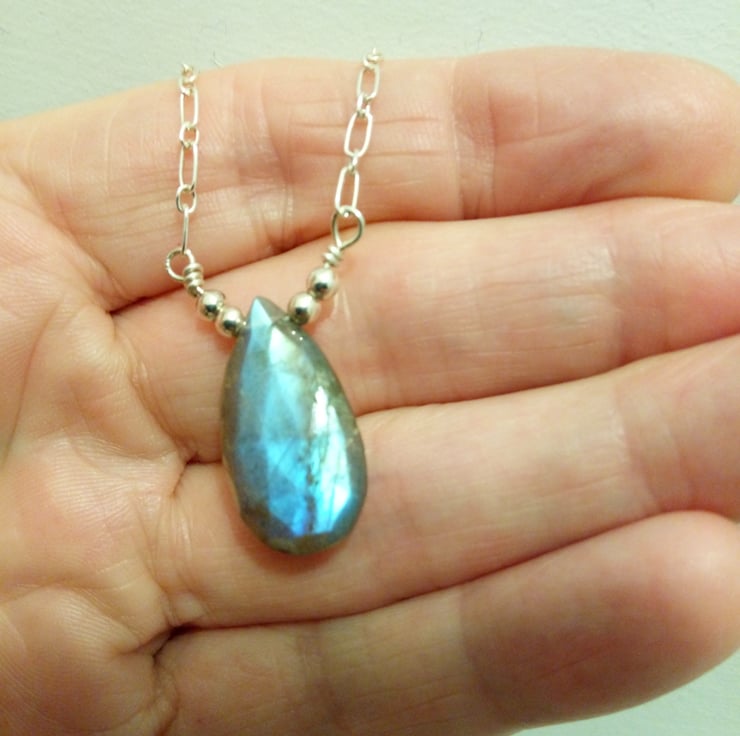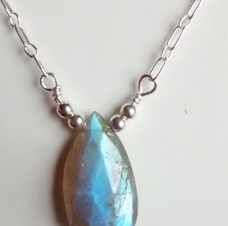 Labradorite hand faceted drop from Madagascar is 25mm x 12mm with lovely blue iridescent sheen.