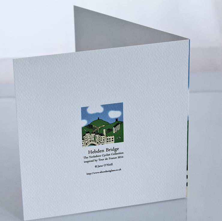 Hebden Bridge featured in the Tour de France 2014 and Tour de Yorkshire 2015. This 15cm card comes with a white envelope, free postage and cellophane wrapped.