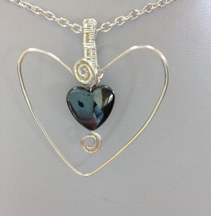 This pendant is handcrafted from silver plated wire, using a weaving technique for the bail, with a hematite heart, It has a silver plated chain and is finished with a silver plated lobster claw clasp.