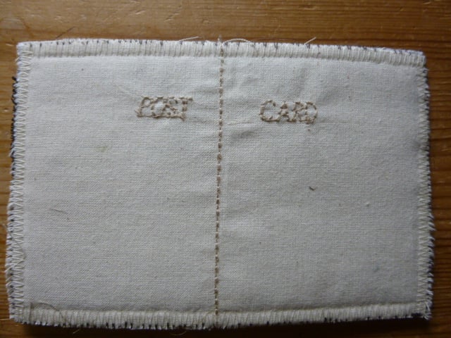 The card measures the standard 6" x 4" and can be posted either in an envelope or as it stands. It is possible to write on the calico with a Biro or marker pen and stick a stamp on for postage. I can guarantee that the postman will want to hand deliver this! Be assured that the card will pass safely through the Post Office franking machine but of course you may want to keep it all to yourself!