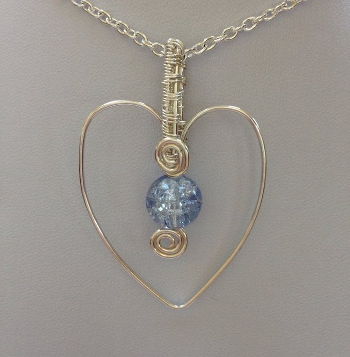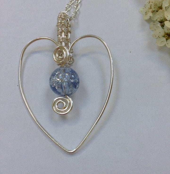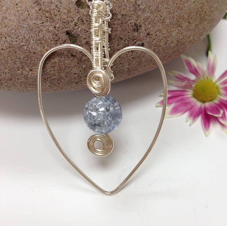 This heart pendant has been handcrafted using silver plated wire and a weaving technique for the bail. It has a lilac crackle glass bead and is finished with a silver plated chain and lobster claw clasp. See my shop for matching bracelet and earrings.