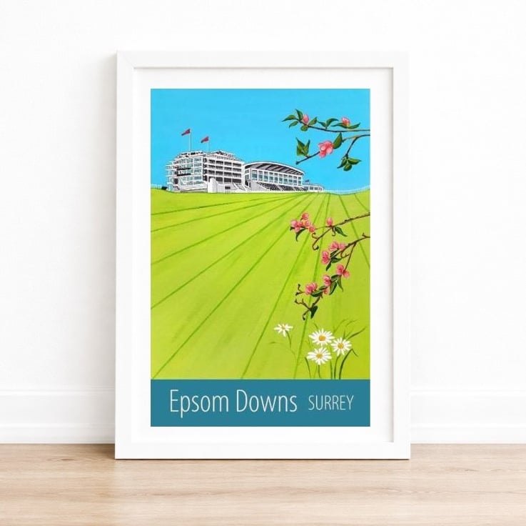 A contemporary travel poster style print of the racecourse at Epsom Downs, home of The Derby, from my own original acrylic painting. A perfect gift for those who love walking on the Downs!