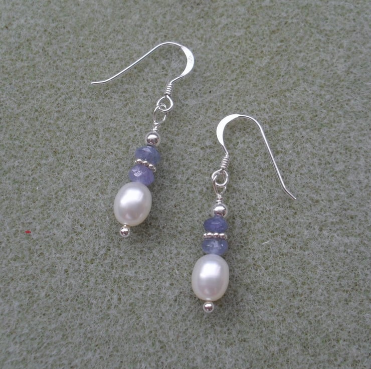 Freshwater coultured pearls and tanzanite gemstones which are attached to sterling silver ear wires