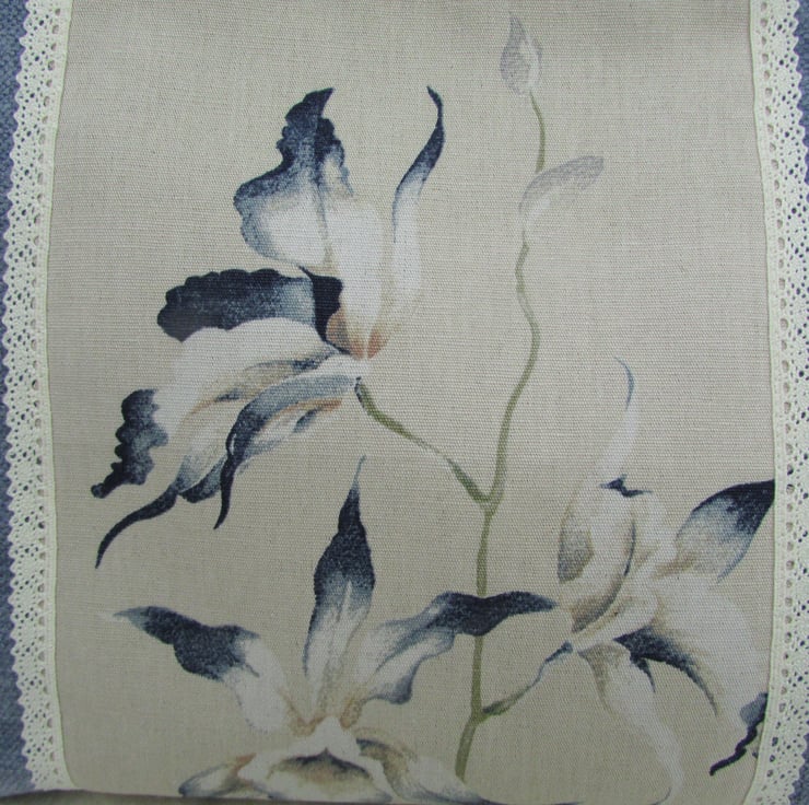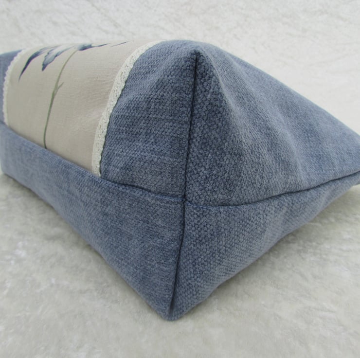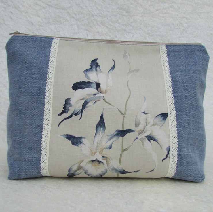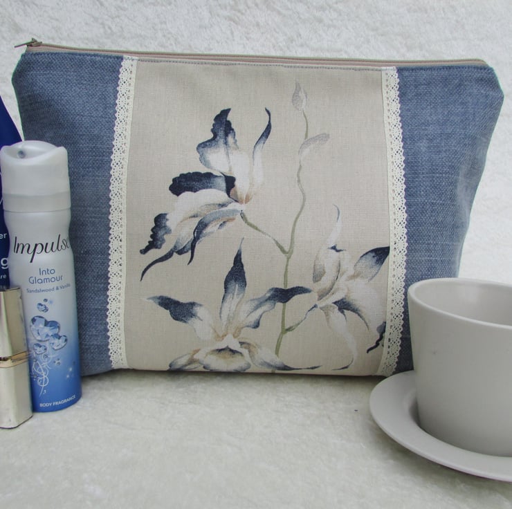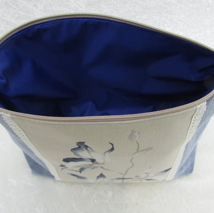 A toiletry bag in blue fabric with a front central panel. The panel is a section of beautiful cream fabric featuring a print pattern of a delicate stem bearing blue and white Irises. The edges of the panel are finished with a pretty cream lacy trim.