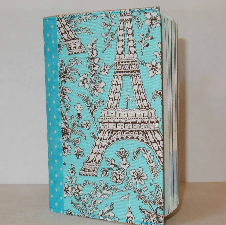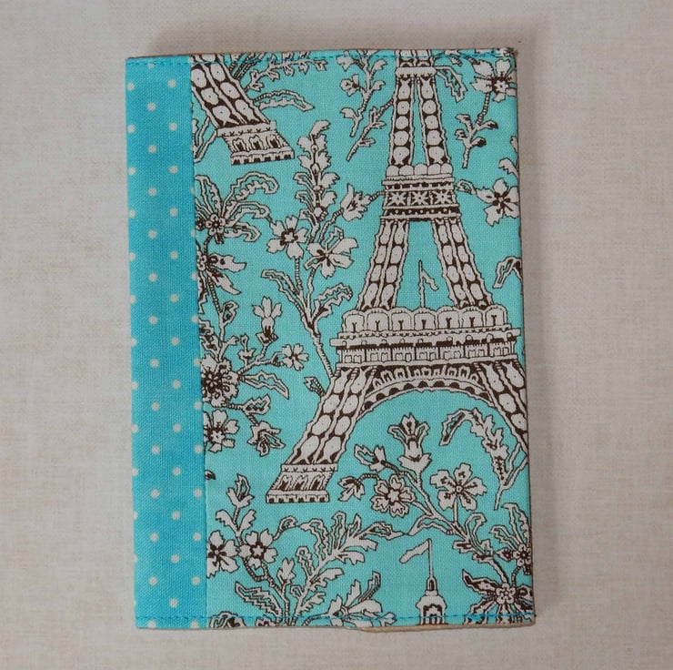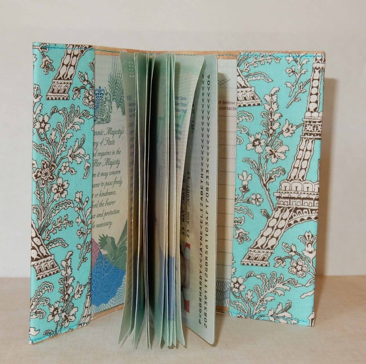 This passport cover would be great for that trip to Paris or anywhere really. It fits a British passport, and it is made from two fabrics, one featuring a representation of the Eiffel Tower with a toning spot fabric on the spine. It is lined in beige fabric, with a layer of interfacing to help protect your passport.