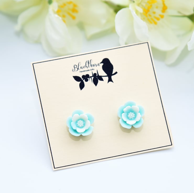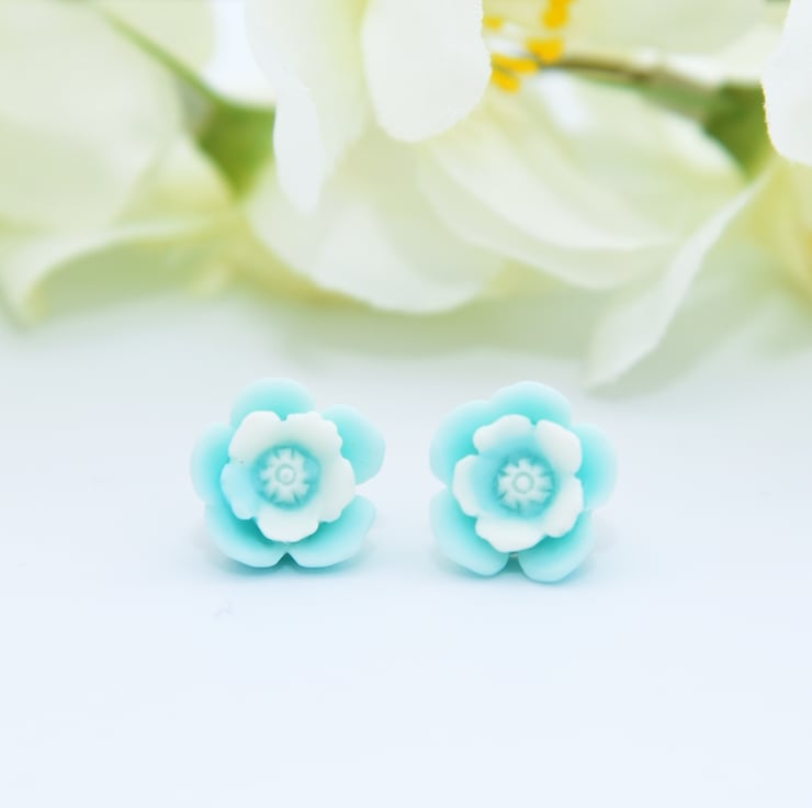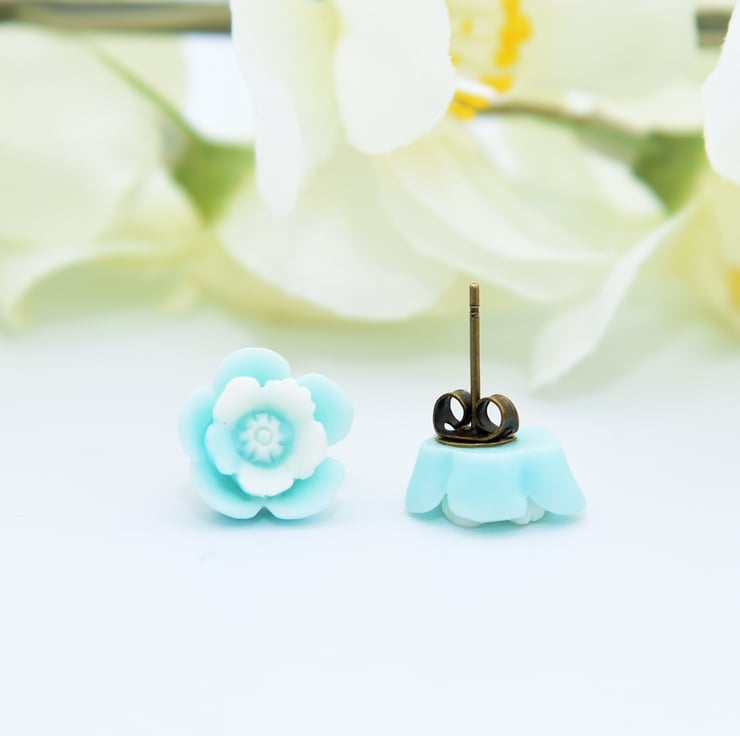 Pretty, vintage-inspired, stud earrings with pale blue and white flower cabochons on antique bronze earring blanks and butterfly backs.