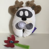 Grey embroidered design on the face. A silver plush dandelion backed with grey suede. Ears are a choice of plush with either white corduroy backing or grey corduroy backing.