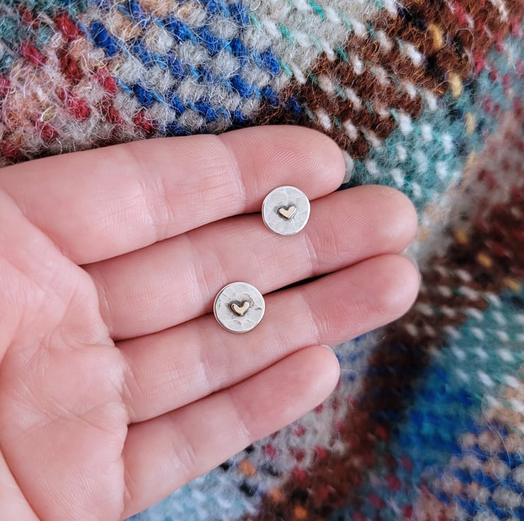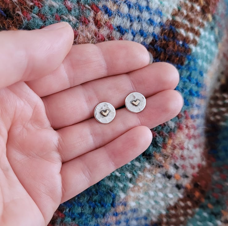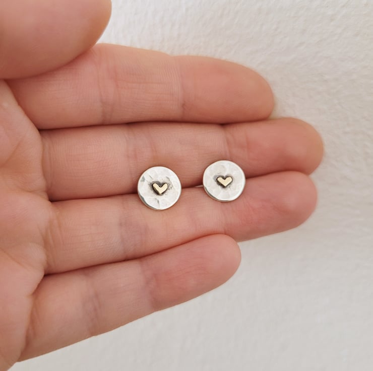 These tiny handmade sterling silver circle shaped stud earrings have been given a hammered texture and finished with recycled 9ct yellow gold hearts. The circles have been soldered onto sterling silver ear posts and come with sterling silver butterfly backs.