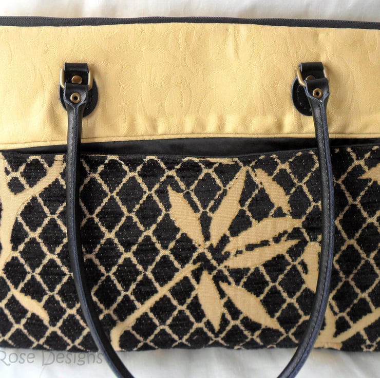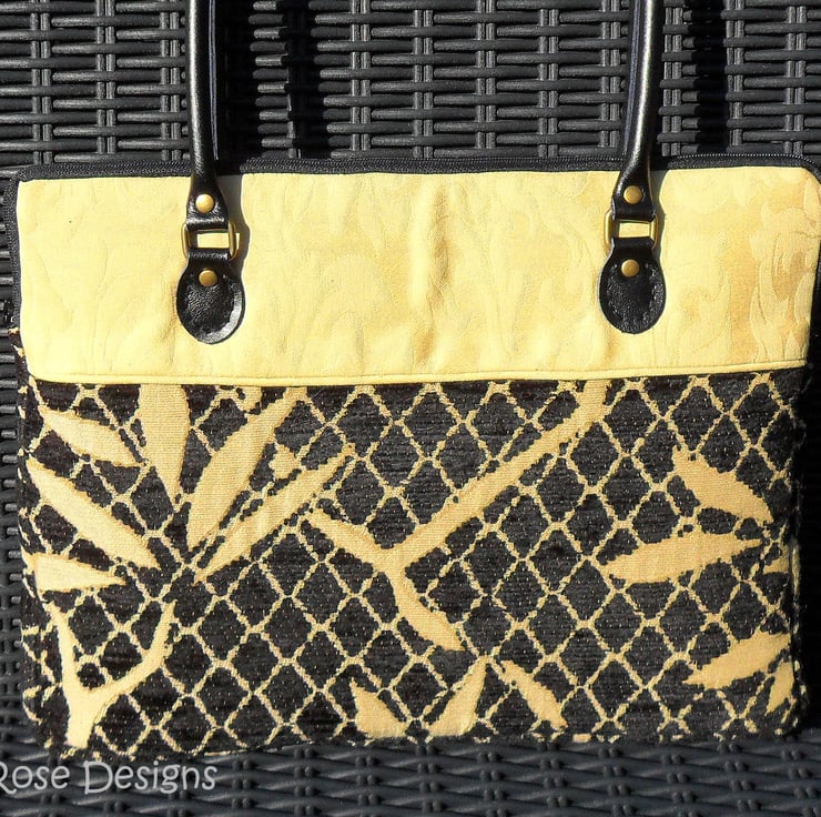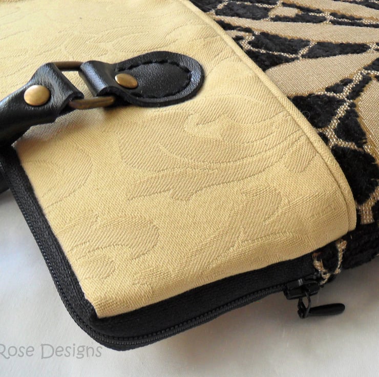 Carry your laptop in style with this handmade case. Made using a black and gold flocked upholstery fabric with a contrasting gold damask top band, and black leather handles. There is a full length pocket on one side of the bag for your notepad and pen or phone. The lining is a black satin and there are two smaller slip pockets. The bag has a zip fastening and is padded to help protect your laptop from knocks and scrapes.
