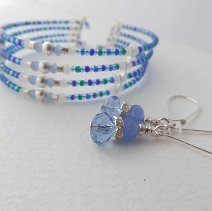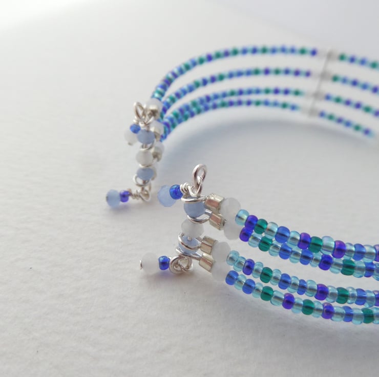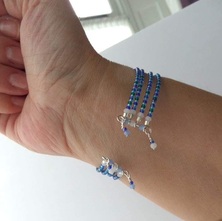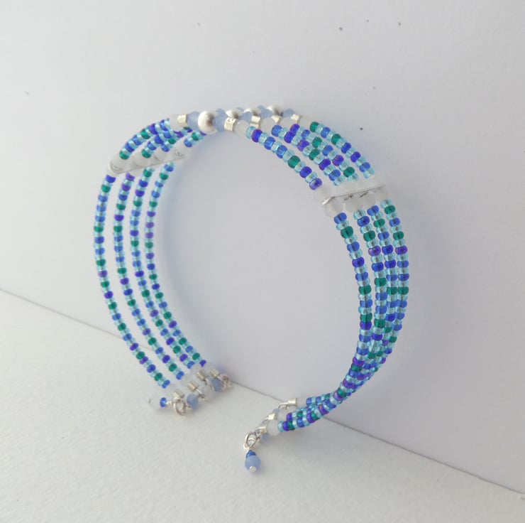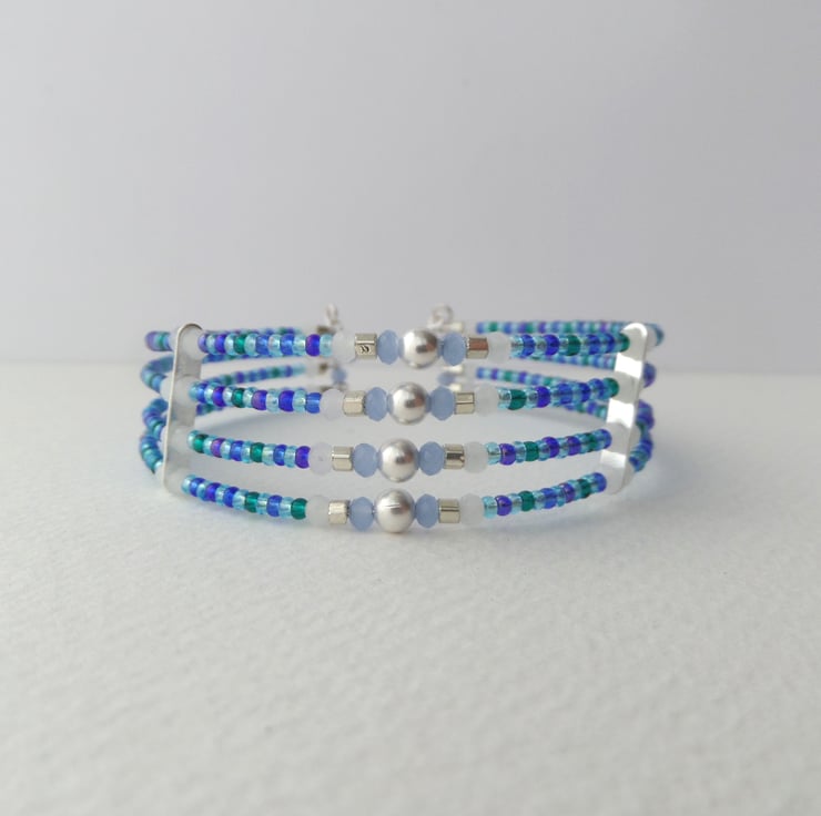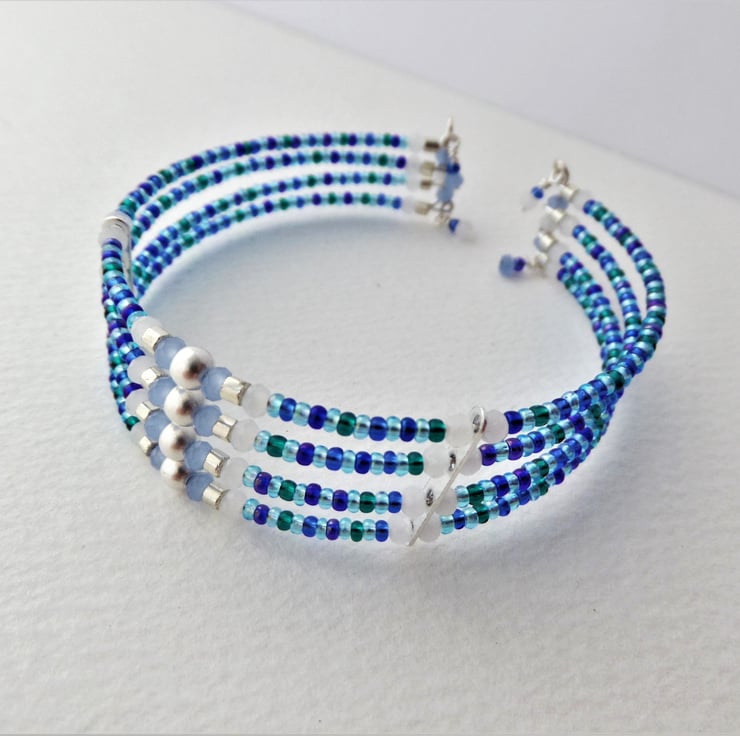 Gorgeous shades of blue, teal and baby blue with white opal crystal and silver beads and a super simple on/off cuff.